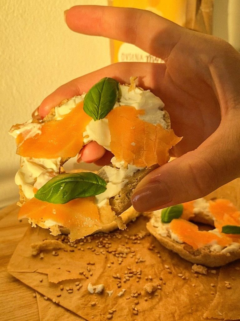 Po peki bagelse prerežemo na pol in dodamo toppinge po izbiri. Odlična kombinacija je kremni sir in dimljen losos.