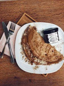 ▪️ Ko je spodnji del palačinke dovolj pečen jo nežno prepognimo.