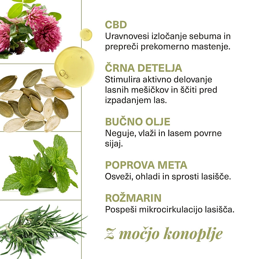 Sestavine: CANNABIS SATIVA SEED OIL, VITIS VINIFERA SEED OIL, HELIANTHUS ANNUUS SEED OIL, RICINUS COMMUNIS SEED OIL, CUCURBITA PEPO SEED OIL, CANNABIS SATIVA LEAF EXTRACT, TRIFOLIUM PRATENSE FLOWER EXTRACT, URTICA DIOICA LEAF EXTRACT, POLYGLYCERYL-3 DIISOSTEARATE, CARTHAMUS TINCTORIUS FLOWER EXTRACT, HIBISCUS SABDARIFFA FLOWER EXTRACT, MENTHA PIPERITA OIL, ROSMARINUS OFFICINALIS LEAF OIL, TOCOPHEROL, LAVANDULA OIL, MELALEUCA ALTERNIFOLIA LEAF OIL, CARVONE*, MENTHOL*, PINENE*, CITRONELLOL*, LIMONENE*, LINALOOL*, TERPINOLENE*, CAMPHOR*, BETA-CARYOPHYLLENE*, TERPINEOL*, LINALYL ACETATE*, GERANYL ACETATE*, ALPHA-TERPINENE*, GERANIOL*.