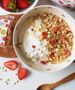 SESTAVINE: ovseni kosmiči, ajdova kaša, agavin sirup, oljčno olje, bela čokolada 4% (sladkor, laktoza, kakavovo maslo, brezvodne mlečne maščobe, modificiran škrob, emulgator sojin lecitin, naravne arome), proseni napihnjenci, liofilizirane jagode 3%.