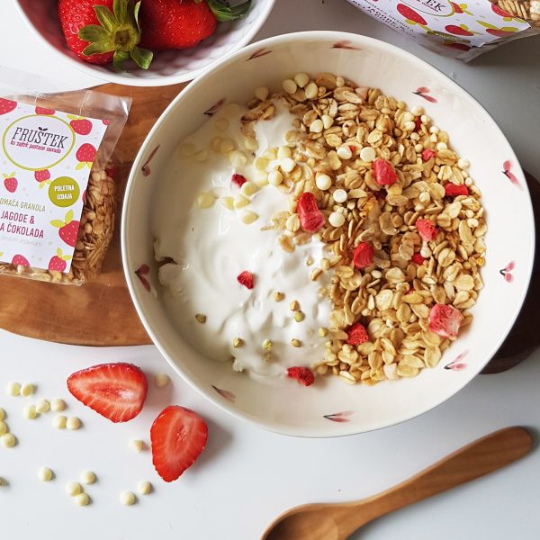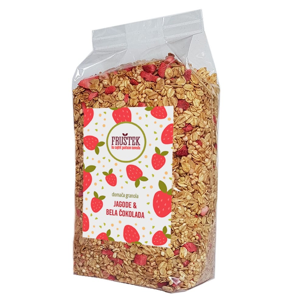 Domača granola Fruštek jagode in bela čokolada je odlična izbira za vse, ki prisegate na domačo granolo brez sladkorja in še posebej obožujete domačo granolo s sadjem, liofiliziranimi jagodami, ajdovo kašo in gurmansko belo čokolado. Domača granola Fruštek je lahko tudi izvirno in okusno darilo.