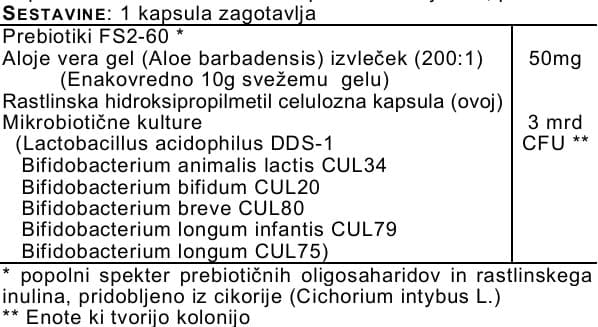 Izdelek vsebuje prebiotično sestavino FS2-60, ki vključuje fruktooligosaharide in rastlinski inulin. Na voljo je v obliki veganskih kapsul in je namenjen dopolnjevanju raznolike in uravnotežene prehrane ter zdravega življenjskega sloga.