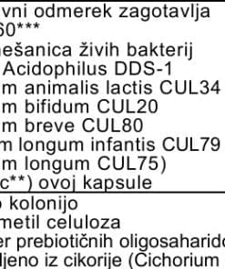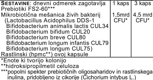 Formulacija vsebuje 1,5 milijarde (1,5 x 10^9) živih mikrobiotičnih kultur na kapsulo. Vključeni so različni sevi mikrobiotičnih kultur, izbrani za uporabo v prehranskih dopolnilih.