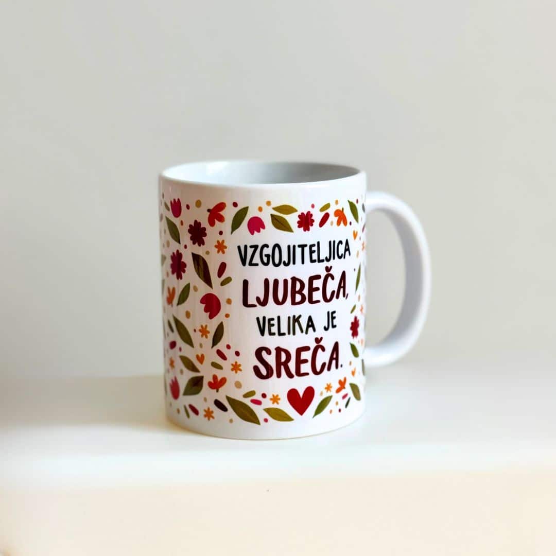 Skodelico krasi ilustracija in ljubezniv napis: “Vzgojiteljica ljubeča, velika je sreča.”