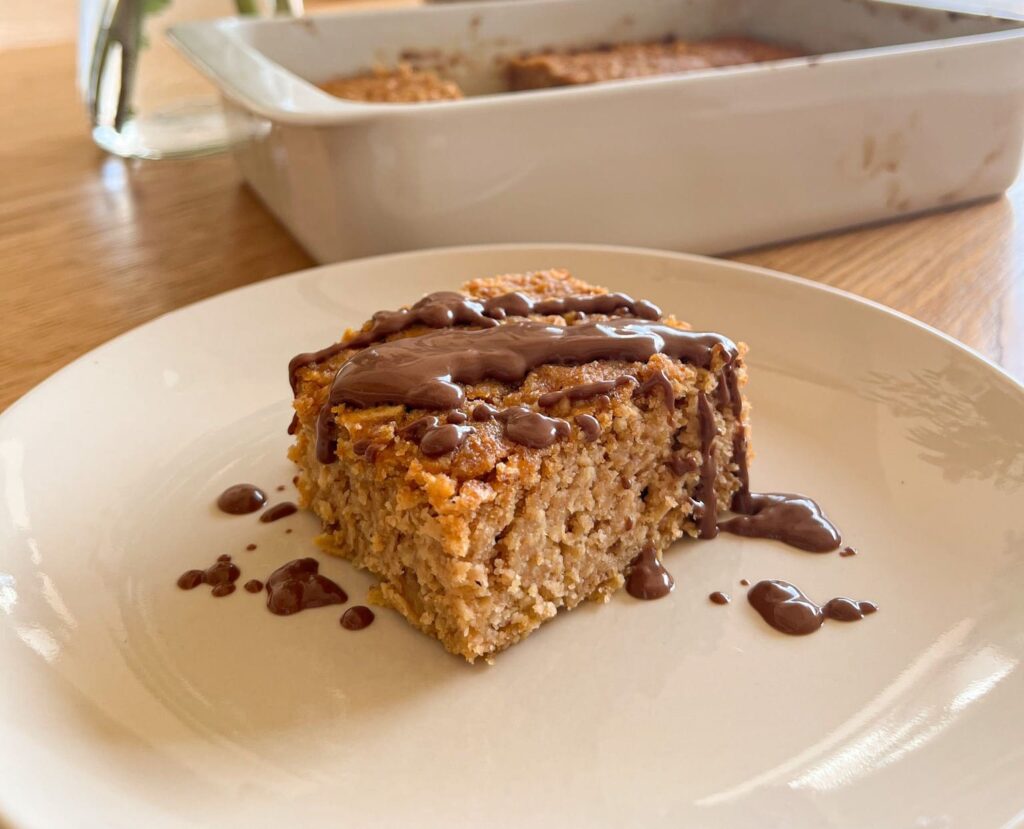 Vse sestavine dobro zmešaš, enakomerno razporediš po pekaču in pečeš 40 min na 180 stopinj. Po želji čez poliješ še topljeno čokolado ali lešnikov namaz, je pa okusen tudi brez. 😉