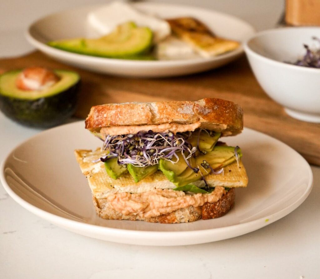 3️⃣ Na popečen kruh namaži humus, dodaj špinačo, tofu, avokado in kalčke. Zaključi s še eno rezino kruha, bogato namazano s humusom.